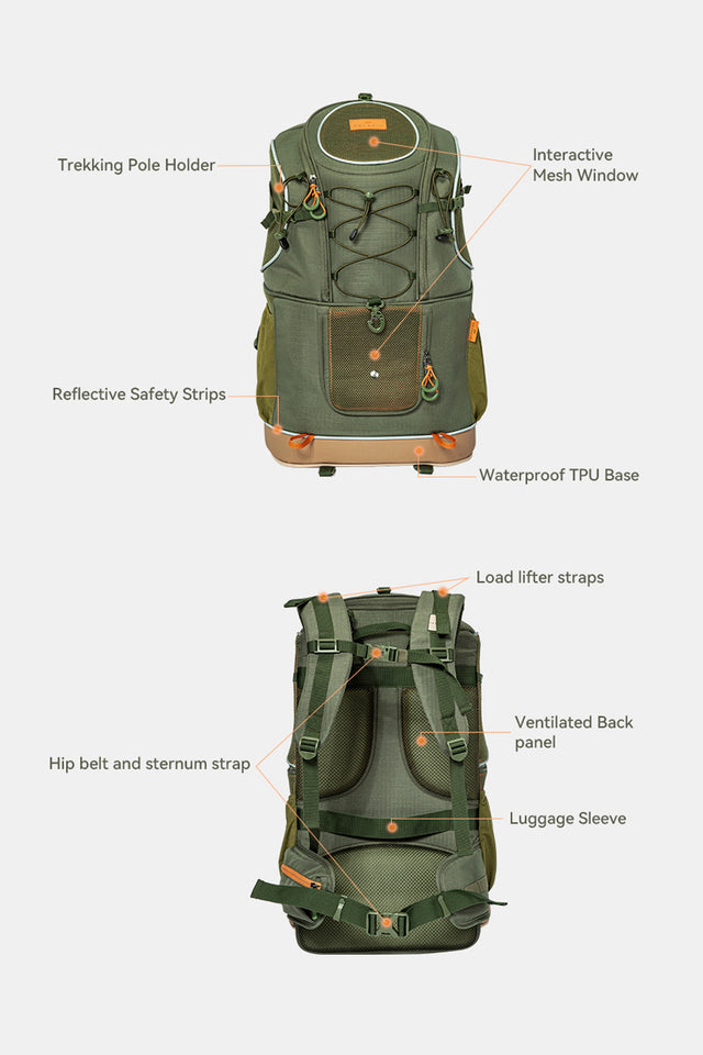 Trail-Ready Features for Outdoor Adventures –Dedicated trekking pole holders for hands-free climbing support, and a bottom compartment ideal for storing a pet sleeping bag or other essential gear