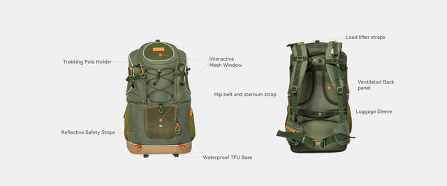Ergonomic Comfort Fit – Body-contouring shoulder straps with adjustable sternum and waist belts help distribute weight evenly, reducing strain during long treks.