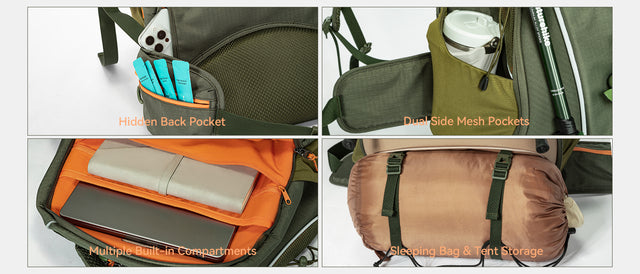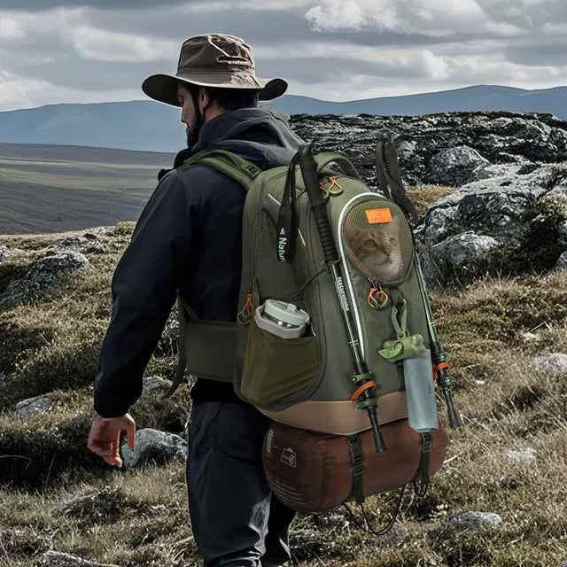 Trail-Ready Features for Outdoor Adventures –Dedicated trekking pole holders for hands-free climbing support, and a bottom compartment ideal for storing a pet sleeping bag or other essential gear